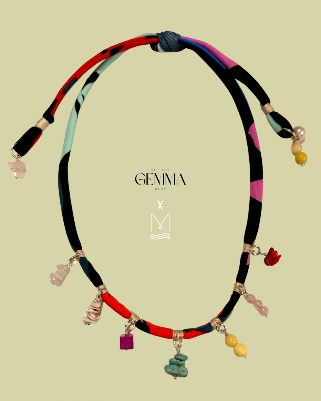 Each charm — from rose quartz to turquoise and coral — is hand-wrapped in silver wire, creating a vibrant piece that celebrates color, movement, and life by the sea.